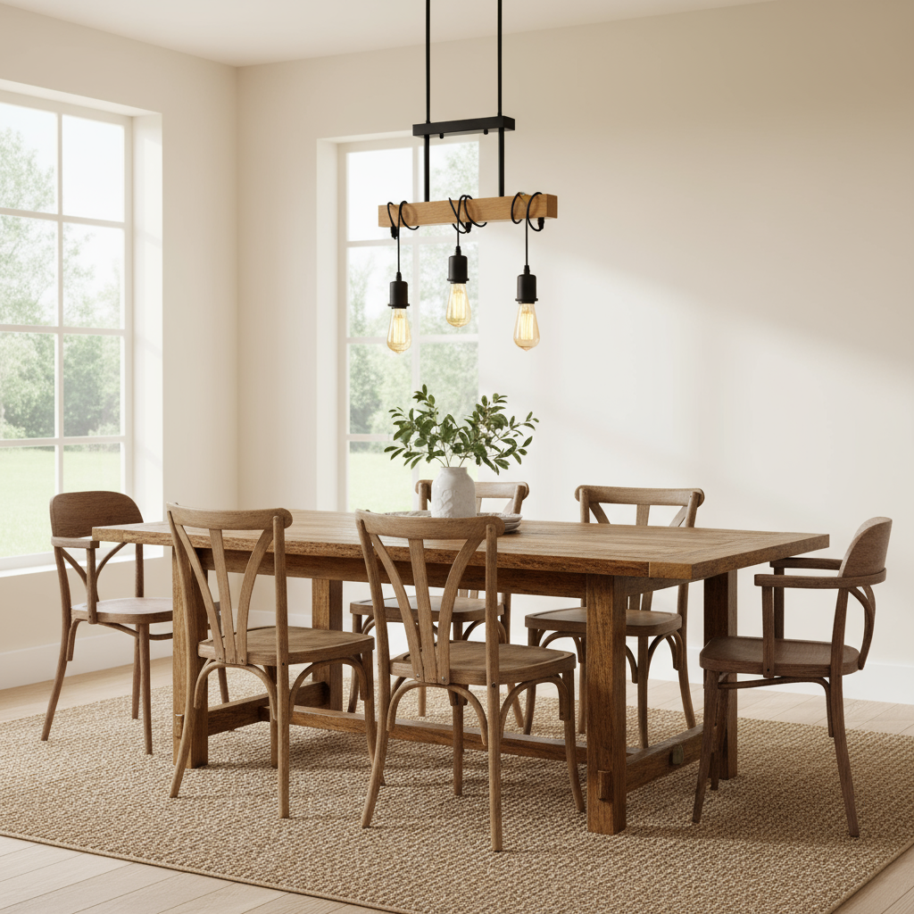 Industriële Zwarte Hanglamp met Verstelbare Hoogte – 3-Lichts Stalen en Houten Ontwerp